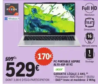 Actuellement en offre chez E.Leclerc : PC PORTABLE ASPIRE AL15-45P-R1YZ ✅ Valable du 24-02 au 7-03.