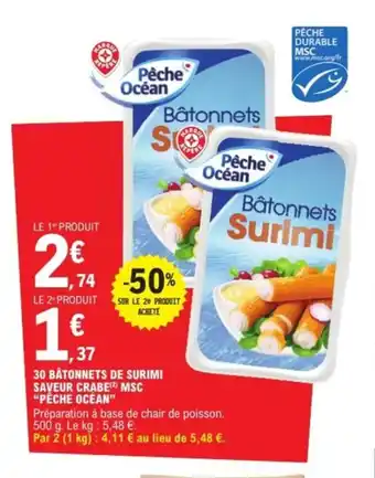 Actuellement en offre chez E.Leclerc : PÊCHE OCÉAN 30 bâtonnets de surimi saveur crabe msc ✅ Valable du 3-02 au 14-02.