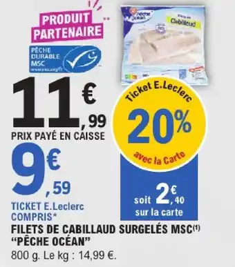 Actuellement en offre chez E.Leclerc : Pêche océan filets de cabillaud surgelés msc ✅ Valable du 21-04 au 2-05.