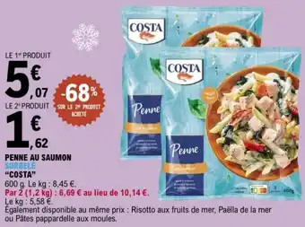 Actuellement en offre chez E.Leclerc : Penne au saumon surgelé costa ✅ Valable du 17-02 au 1-03.
