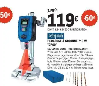 En plus de l'offre PERCEUSE À COLONNE 710 W DP60, E.Leclerc propose une large gamme de produits. Consultez le Catalogue E.Leclerc Brico hebdomadaire pour découvrir les meilleures offres et promotions. En plus de PERCEUSE À COLONNE 710 W DP60, il y a aussi : Scheppach - perceuse a colonne 710 w dp60, SCHEPPACH Perceuse à colonne digitale 710 w & Perceuse à percussion 20V sans fil.