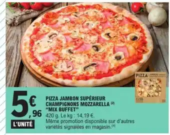 Actuellement en offre chez E.Leclerc : PIZZA JAMBON SUPÉRIEUR CHAMPIGNONS MOZZARELLA “MIX BUFFET” ✅ Valable du 27-01 au 7-02.