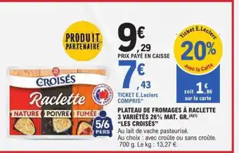 Offre Plateau de fromages à raclette 3 variétés 26% mat. gr. Les Croisés chez E.Leclerc