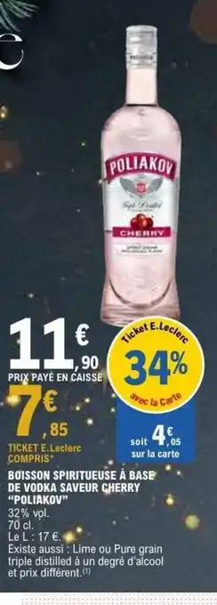 Actuellement en offre chez E.Leclerc : POLIAKOV Boisson spiritueuse à base de vodka saveur cherry ✅ Valable du 23-12 au 3-01.