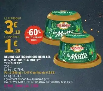 Actuellement en offre chez E.Leclerc : PRÉSIDENT Beurre gastronomique demi-sel 80% mat. gr. la motte ✅ Valable du 16-12 au 27-12.