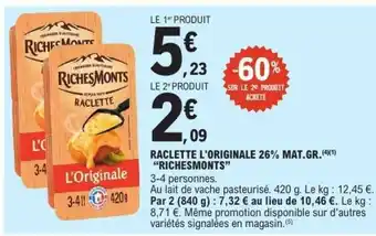 Actuellement en offre chez E.Leclerc : RACLETTE L’ORIGINALE 26% MAT.GR. “RICHESMONTS” ✅ Valable du 6-01 au 17-01.