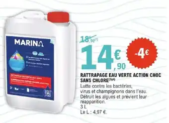 En plus de l'offre RATTRAPAGE EAU VERTE ACTION CHOC SANS CHLORE, E.Leclerc propose une large gamme de produits. Consultez le Catalogue E.Leclerc hebdomadaire pour découvrir les meilleures offres et promotions. En plus de RATTRAPAGE EAU VERTE ACTION CHOC SANS CHLORE, il y a aussi : MARINA Rattrapage eau verte action choc sans chlore, Chlore choc & FONTAINE À EAU SANS FIL VERTE BANDIT.