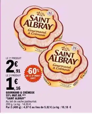 En plus de l'offre SAINT ALBRAY GOURMAND & CRÉMEUX, E.Leclerc propose une large gamme de produits. Consultez le Catalogue E.Leclerc hebdomadaire pour découvrir les meilleures offres et promotions. En plus de SAINT ALBRAY GOURMAND & CRÉMEUX, il y a aussi : SAINT ALBRAY Gourmand & crémeux 33% mat.gr, Saint albray & Sur la gamme saint albray et vieux pane.