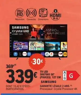 En plus de l'offre SAMSUNG TV LED 50U7005, E.Leclerc propose une large gamme de produits. Consultez le Catalogue E.Leclerc hebdomadaire pour découvrir les meilleures offres et promotions. En plus de SAMSUNG TV LED 50U7005, il y a aussi : SMART TV LED “SAMSUNG”, Samsung - smart tv led & SMART TV LED “SAMSUNG”.