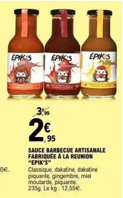Actuellement en offre chez E.Leclerc : SAUCE BARBECUE ARTISANALE FABRIQUÉE À LA REUNION “EPIK’S” ✅ Valable du 13-01 au 25-01.