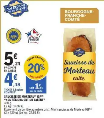 En plus de l'offre Saucisse de Morteau, E.Leclerc propose une large gamme de produits. Consultez le Catalogue E.Leclerc hebdomadaire pour découvrir les meilleures offres et promotions. En plus de Saucisse de Morteau, il y a aussi : Saucisse de morteau igp morteau saucisse, Saucisse de Morteau IGP & Saucisse de Morteau cuite.