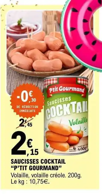 Actuellement en offre chez E.Leclerc : SAUCISSES COCKTAIL “P’TIT GOURMAND” ✅ Valable du 24-02 au 8-03.