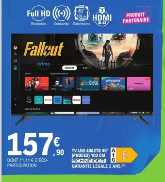 Actuellement en offre chez E.Leclerc : Schneider tv led 40a2tg 40 (pouces) 100 cm ✅ Valable du 21-04 au 2-05.