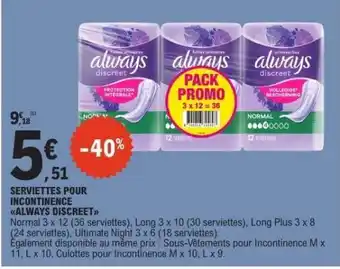 Actuellement en offre chez E.Leclerc : SERVIETTES POUR INCONTINENCE ALWAYS DISCREET ✅ Valable du 17-03 au 28-03.