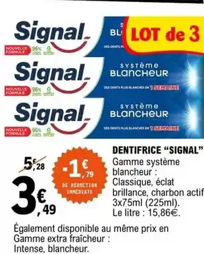 En plus de l'offre Signal - dentifrice, E.Leclerc propose une large gamme de produits. Consultez le Catalogue E.Leclerc hebdomadaire pour découvrir les meilleures offres et promotions. En plus de Signal - dentifrice, il y a aussi : SIGNAL Dentifrice, Signal - dentifrice intégral 8 & Signal - dentifrice intégral 8.