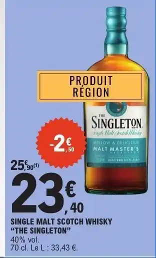 Actuellement en offre chez E.Leclerc : Single Malt Scotch Whisky THE SINGLETON ✅ Valable du 3-03 au 14-03.