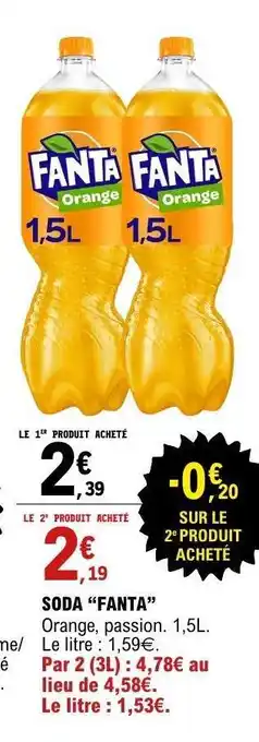 En plus de l'offre Soda 'Fanta', E.Leclerc propose une large gamme de produits. Consultez le Catalogue E.Leclerc hebdomadaire pour découvrir les meilleures offres et promotions. En plus de Soda 'Fanta', il y a aussi : Soda 'Fanta', Soda fanta orange, & Soda FANTA Orange, 2 L.