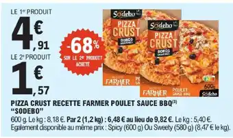 Actuellement en offre chez E.Leclerc : Sodebo pizza crust recette farmer poulet sauce bbq ✅ Valable du 7-04 au 18-04.