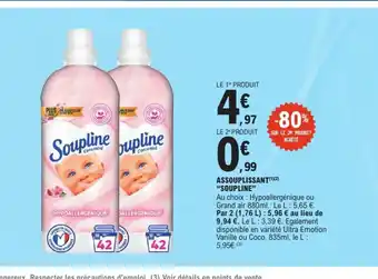 L'offre est disponible dans plusieurs magasins, vérifiez tous les produits pour obtenir le SOUPLINE Assouplissant le moins cher. Si vous souhaitez savoir si l'article est en vente avec une plus grosse remise dans un autre magasin, consultez la catégorie 'Supermarché'. Ces offres pourraient aussi vous intéresser : Soupline assouplissant(1)(2), Soupline assouplissant 45 lavages 1 l & SOUPLINE Assouplissant 45 lavages.