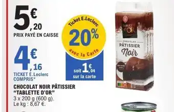 Actuellement en offre chez E.Leclerc : TABLETTE D'OR Chocolat noir pâtissier ✅ Valable du 16-12 au 27-12.