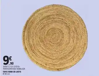 L'offre est disponible dans plusieurs magasins, vérifiez tous les produits pour obtenir le Tapis rond en juste le moins cher. Si vous souhaitez savoir si l'article est en vente avec une plus grosse remise dans un autre magasin, consultez la catégorie 'Supermarché'. Ces offres pourraient aussi vous intéresser : Tapis rond en jute, Tapis décor rond pétales & Tapis jute rond tressé 90 cm.