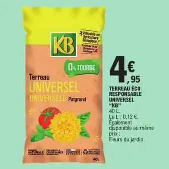 Actuellement en offre chez E.Leclerc : TERREAU ÉCO RESPONSABLE UNIVERSEL “KB” ✅ Valable du 7-04 au 18-04.