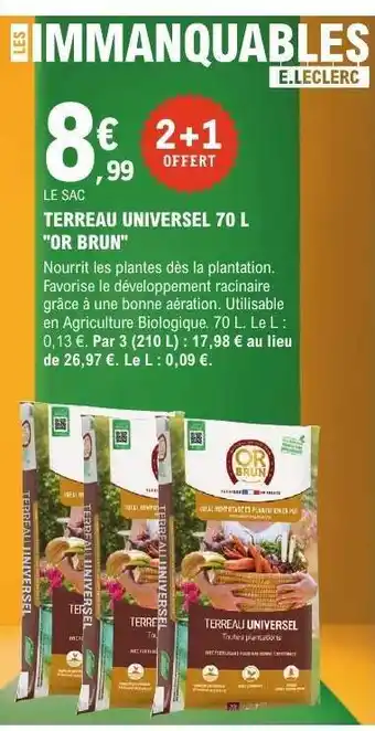 Actuellement en offre chez E.Leclerc : TERREAU UNIVERSEL 70 L OR BRUN ✅ Valable du 17-02 au 28-02.