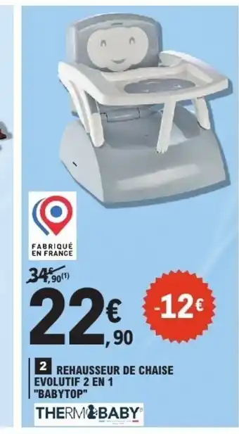 Actuellement en offre chez E.Leclerc : THERMO BABY Rehausseur de chaise evolutif 2 en 1 babytop ✅ Valable du 13-01 au 24-01.