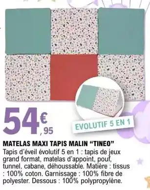 Actuellement en offre chez E.Leclerc : Tinéo - matelas maxi tapis malin ✅ Valable du 10-03 au 22-03.