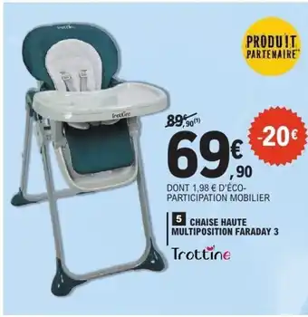 Découvrez les produits les moins chers parmi toutes les offres ! Si vous voulez savoir si E.Leclerc propose la meilleure remise pour TROTTINE Chaise haute multiposition faraday 3, comparez-la sur la page thèmes ou avec d'autres magasins.