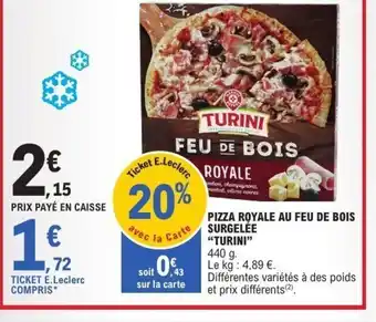 Actuellement en offre chez E.Leclerc : TURINI Pizza royale au feu de bois surgelée ✅ Valable du 16-12 au 27-12.