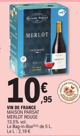 En plus de l'offre Vin de France, E.Leclerc propose une large gamme de produits. Consultez le Catalogue E.Leclerc hebdomadaire pour découvrir les meilleures offres et promotions. En plus de Vin de France, il y a aussi : Vin de France, Vin de france cafe de paris & VIN DE FRANCE TERRE MÉTISSÉE.