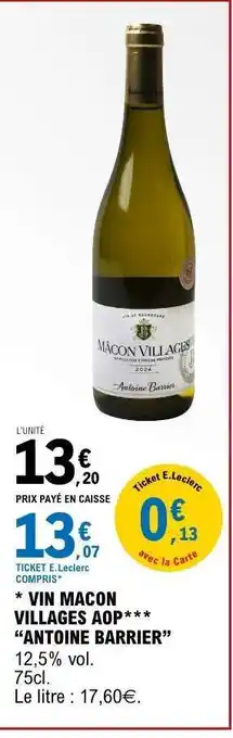 VIN MACON VILLAGES AOP*** “ANTOINE BARRIER” offres et promotions en ligne chez E.Leclerc
