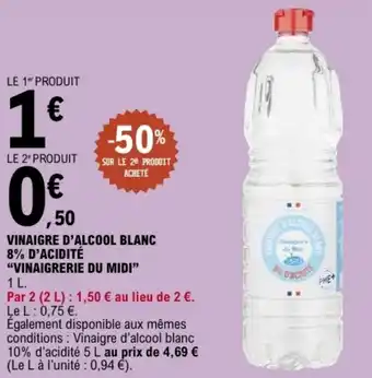 Actuellement en offre chez E.Leclerc : Vinaigre d'alcool blanc 8% d'acidité vinaigrerie du midi ✅ Valable du 17-02 au 1-03.