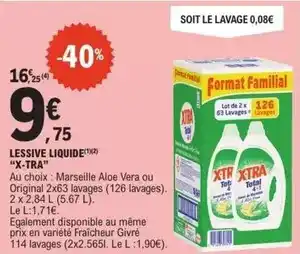 En plus de l'offre X-tra - lessive liquide, E.Leclerc propose une large gamme de produits. Consultez le Catalogue E.Leclerc hebdomadaire pour découvrir les meilleures offres et promotions. En plus de X-tra - lessive liquide, il y a aussi : X-tra - lessive liquide, X-tra lessive liquide & LESSIVE LIQUIDE X-TRA.