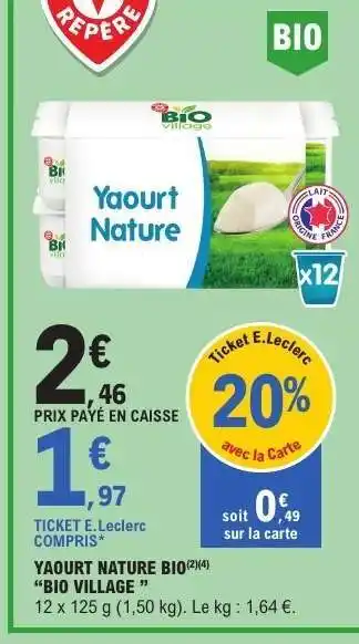 Actuellement en offre chez E.Leclerc : YAOURT NATURE BIO 'BIO VILLAGE' ✅ Valable du 24-02 au 7-03.