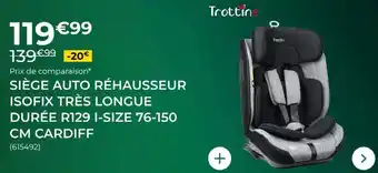 En plus de l'offre Trottine - siège auto réhausseur isofix très longue durée r129 i-size 76-150 cm cardiff, Feu Vert propose une large gamme de produits. Consultez le Catalogue Feu Vert hebdomadaire pour découvrir les meilleures offres et promotions. En plus de Trottine - siège auto réhausseur isofix très longue durée r129 i-size 76-150 cm cardiff, il y a aussi : Trottine - siège auto réhausseur très longue durée r129 76-150 cm cambridge, Siege auto lunar i size isofix & Siège auto ceinture i-size 76-150 cm.