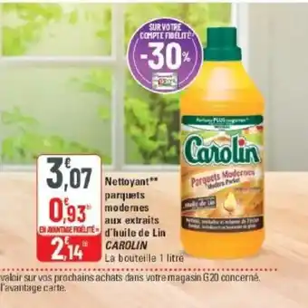 Actuellement en offre chez G20 : CAROLIN Nettoyant parquets modernes aux extraits d'huile de lin ✅ Valable du 11-03 au 22-03.