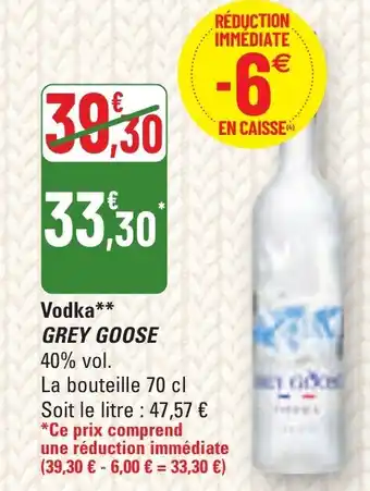 Actuellement, GREY GOOSE Vodka est en promotion chez G20. Toutes les informations utiles comme le prix, les conditions et la durée de validité sont affichées sur cette page. Consultez également les promotions similaires pour GREY GOOSE Vodka, afin de faire le meilleur choix. La promo GREY GOOSE Vodka est valable du 17-12-2025 au 31-12-2025. Si elle est expirée, regardez les autres offres équivalentes. Vous pouvez aussi suivre cette catégorie de produit pour être alerté lorsqu’une nouvelle promotion GREY GOOSE Vodka apparaît chez G20.Questions fréquemment posées au sujet de GREY GOOSE Vodka