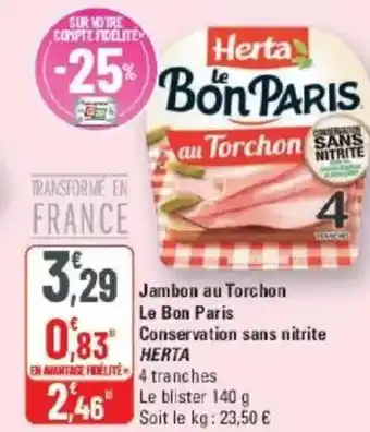 Actuellement en offre chez G20 : HERTA Jambon au Torchon Le Bon Paris Conservation sans nitrite ✅ Valable du 11-03 au 22-03.