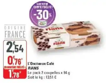 L'offre est disponible dans plusieurs magasins, vérifiez tous les produits pour obtenir le L'onctueux café rians le moins cher. Si vous souhaitez savoir si l'article est en vente avec une plus grosse remise dans un autre magasin, consultez la catégorie 'Supermarché'. Ces offres pourraient aussi vous intéresser : L'Onctueux RIANS, Dessert l'onctueux rians & L'onctueux vanille et spéculoos rians.