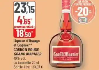 En plus de l'offre Liqueur d'orange et cognac cordon rouge grand marnier, G20 propose une large gamme de produits. Consultez le Catalogue G20 hebdomadaire pour découvrir les meilleures offres et promotions. En plus de Liqueur d'orange et cognac cordon rouge grand marnier, il y a aussi : GRAND MARNIER Liqueur d'orange amère et de cognac, Liqueur Cordon Rouge GRAND MARNIER & Grand marnier liqueur cordon rouge.