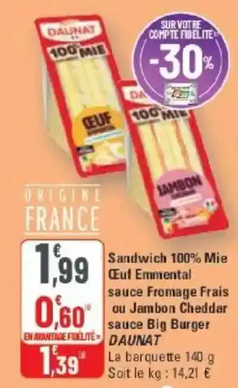 Sandwich 100% mie œuf emmental sauce fromage frais ou jambon cheddar sauce big burger daunat 140 g