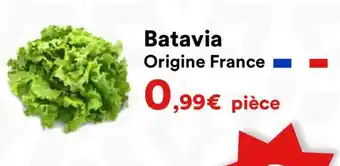 L'offre est disponible dans plusieurs magasins, vérifiez tous les produits pour obtenir le Batavia le moins cher. Si vous souhaitez savoir si l'article est en vente avec une plus grosse remise dans un autre magasin, consultez la catégorie 'Supermarché'. Ces offres pourraient aussi vous intéresser : Batavia, Laitue batavia rouge grenobloise & offre 3.