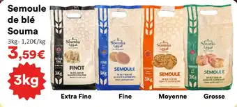 L'offre est disponible dans plusieurs magasins, vérifiez tous les produits pour obtenir le Semoule de blé souma le moins cher. Si vous souhaitez savoir si l'article est en vente avec une plus grosse remise dans un autre magasin, consultez la catégorie 'Supermarché'. Ces offres pourraient aussi vous intéresser : PRIMEAL Semoule de blé blanche fine, Blé & Carrefour - farine de blé.