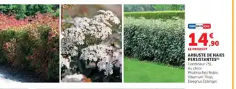 Actuellement, Arbuste de haies persistantes est en promotion chez Hyper U. Toutes les informations utiles comme le prix, les conditions et la durée de validité sont affichées sur cette page. Consultez également les promotions similaires pour Arbuste de haies persistantes, afin de faire le meilleur choix. La promo Arbuste de haies persistantes est valable du 24-02-2026 au 22-03-2026. Si elle est expirée, regardez les autres offres équivalentes. Vous pouvez aussi suivre cette catégorie de produit pour être alerté lorsqu’une nouvelle promotion Arbuste de haies persistantes apparaît chez Hyper U.Questions fréquemment posées au sujet de Arbuste de haies persistantes