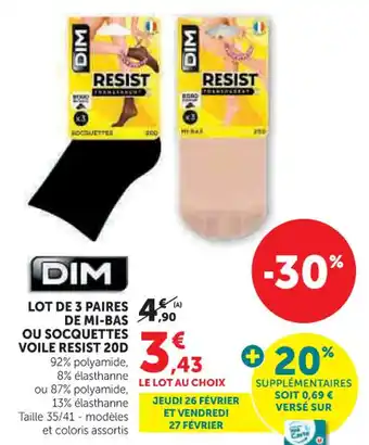Le prix de l'offre Dim lot de 3 paires de mi-bas ou socquettes voile resist 20d se trouve également en haut de la page, ainsi que la date à laquelle l'offre est disponible. Vous pouvez également vérifier les prix dans le Catalogue Hyper U actuel ou sur le site Internet de Hyper U. Les offres vous permettent d'acheter les produits Hyper U au prix le plus bas.
