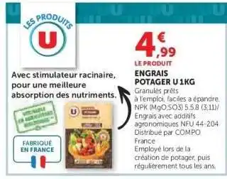 En plus de l'offre ENGRAIS POTAGER U 1KG, Hyper U propose une large gamme de produits. Consultez le Catalogue Hyper U hebdomadaire pour découvrir les meilleures offres et promotions. En plus de ENGRAIS POTAGER U 1KG, il y a aussi : U engrais potager, U engrais potager & STAR JARDIN Engrais potager.