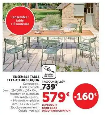 Le prix de l'offre ENSEMBLE TABLE ET FAUTEUILS LUÇON se trouve également en haut de la page, ainsi que la date à laquelle l'offre est disponible. Vous pouvez également vérifier les prix dans le Catalogue Hyper U actuel ou sur le site Internet de Hyper U. Les offres vous permettent d'acheter les produits Hyper U au prix le plus bas.