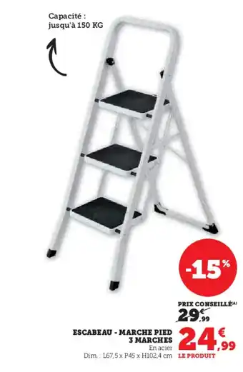 En plus de l'offre Escabeau - marche pied 3 marches, Hyper U propose une large gamme de produits. Consultez le Catalogue Hyper U hebdomadaire pour découvrir les meilleures offres et promotions. En plus de Escabeau - marche pied 3 marches, il y a aussi : Escabeau marche pied 3 marches, Escabeau 5 Marches & Marche-pied en métal 3 marches.